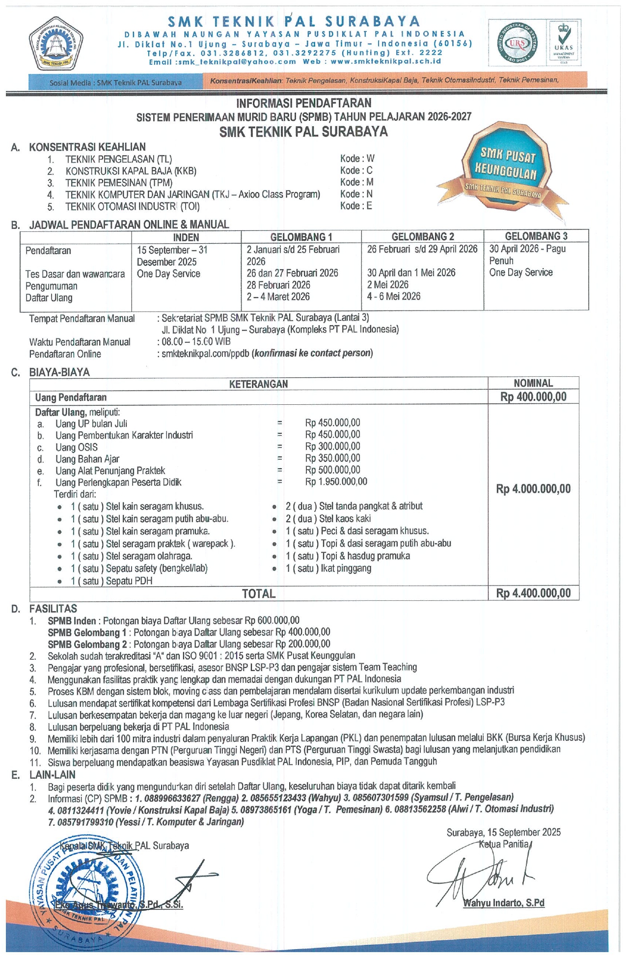 berikut rincian biaya pendaftaran SPMB 2026/2027 Inden SMK Teknik PAL Surabaya